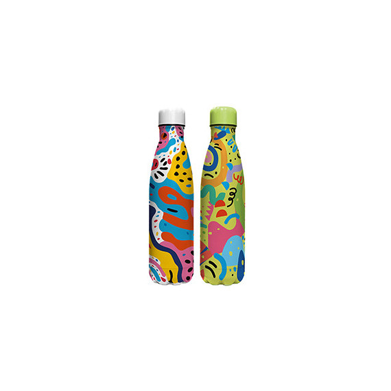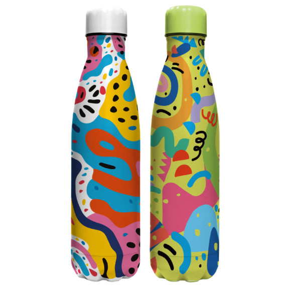 Borracca termica con doppia parete in acciaio inox, mantiene le bevande calde o fredde fino a 12 ore. Grafica di disegn moderno in rilievo 4D. 2 fantasie assortite.