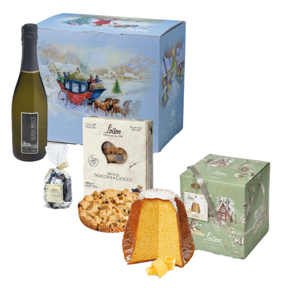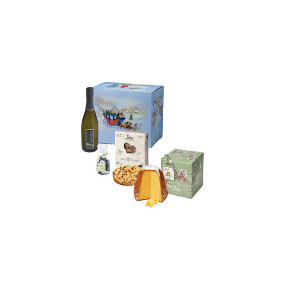 Scatola in cartoncino color indaco stampata a tema natalizio. Contiene: Pandoro classico linea Top Foresta, 1kg Sbrisola Mandorla Mais, con farina di mais marano e mandorle, in astuccio, 200gr Amaretti misti morbidi, gusti mandorla e cappuccino, incartati singolarmente, in sacchetto regalo, 150gr Tartufini, con cioccolato al latte in confezione regalo, 80gr Bottiglia di vino spumante Pinot Brut Nani Castello di Rubaro, 75cl