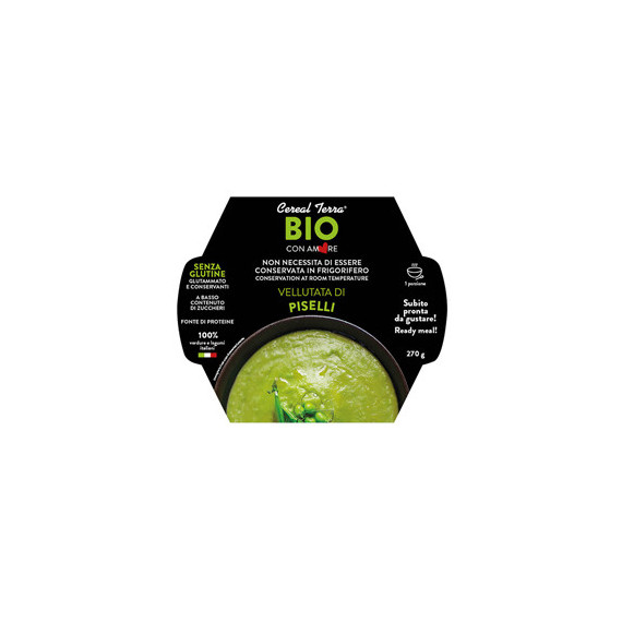Vellutata di piselli senza conservanti con verdure e legumi italiani.Ingredienti: Piselli* 46%, acqua, cipolla*, olio extravergine di oliva*, sale marino. *BIOLOGICO