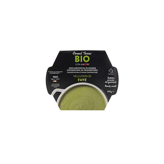 Vellutata di Fave Bio di Cereal Terra: una cremosissima zuppa già pronta Ingredienti: Acqua, purea di fave* 28%, olio extra vergine di oliva*, cipolla*, sale marino, antiossidante: estratto di rosmarino*, pepe nero*. *BIOLOGICO. Può contenere tracce di soia, cereali contenenti glutine, frutta a guscio, sesamo, sedano e senape.