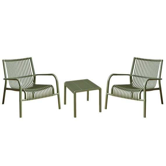 Set da giardino composto da due poltrone e un tavolino. Struttura in polipropilene, stabilizzato UV. Poltron: 75,5x63,5x69cm. Tavolino 43x43x40cm. Adatta sia per ambienti outdoor che indoor, prodotto destinato ad uso domestico.