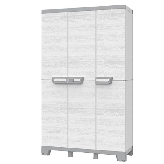 Armadio a 3 ante con gancio appenditutto in dotazione e piedini. Composto da 2 vani separati: vano tuttopiani a sviluppo orizzontale (larghezza cm. 68) con 3 ripiani interni regolabili, vano libero a sviluppo verticale (larghezza cm. 34). Dimensioni: 102 x 39 x 172 cm Pratica apertura delle ante fino a 180°.