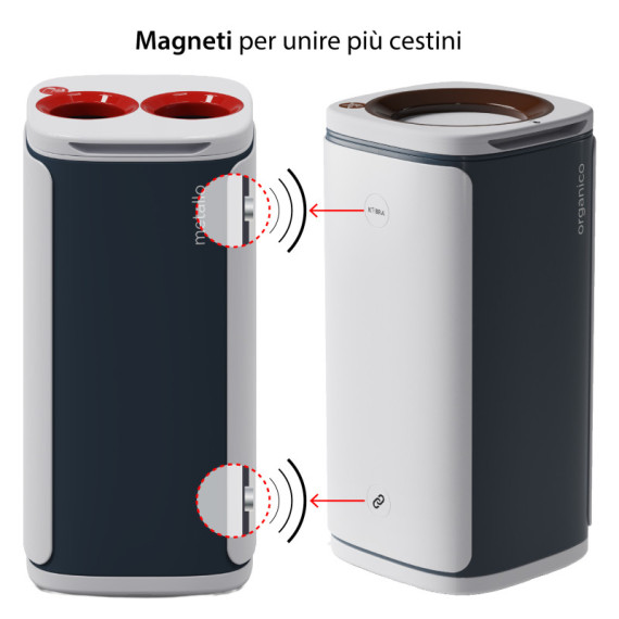 Il design elegante e moderno permette la sua collocazione in ogni tipo di ambiente. Ideale per creare isole ecologiche in ufficio e negli spazi pubblici. Due aree circolari, presenti ai lati della scocca esterna, contengono dei magneti per far agganciare facilmente i vari moduli. Contenitori stabili costruiti in ABS e PP riciclabilial 100% riciclabili. Facile e veloce il sistema per lo svuotamento del sacco con apertura a basculante del coperchio. Capacità cestino 60 lt. Dimensioni: (LxPxH) 34x34,5x70,5.