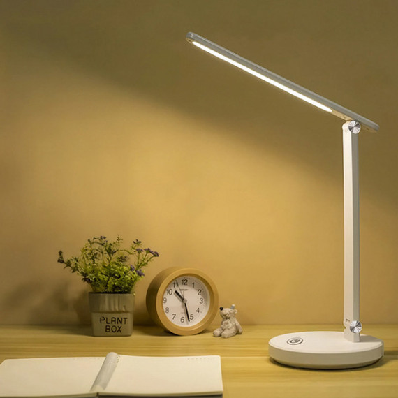 Lampada da scrivania a LED ricaricabile. 320lm touch dimmer. Temperatura colore regolabile 3000/4500/6500 K - 5 modalità di regolazione della luminostità. Con autonomia 8 ore e protezione UV per occhi. Alimentazione con cavo USB A- TYPE-C in dotazione.