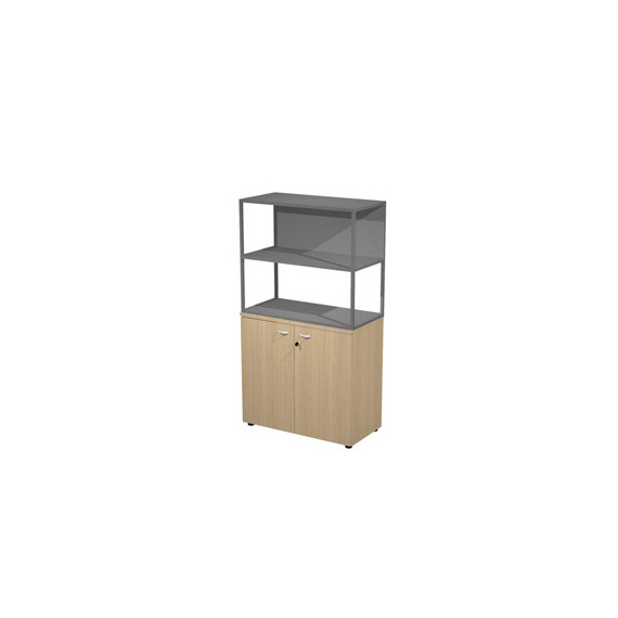 Libreria in metallo a 2 vani con struttura 20x20 mm a giorno con ripiani, base, cappello e un dietro in melaminico , sovrapposta ad un armadio basso, completo di ante battenti con serratura. Libreria metal completa di 1 dietro in melaminico posizionabile a scelta in fase di montaggio. Dimensioni: 90x46xH165cmColore mobile rovere / colore ante rovere / colore mensole antracite / struttura antracite