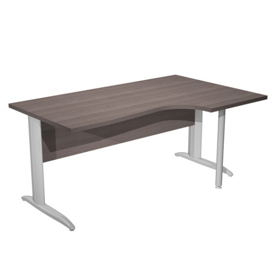 Scrivania compact destro sagomata con fianchi metal ad L verniciati effetto cromato. Spessore 22mm. Completi di canalina passacavi e piedini regolabili in altezza e supporto metal. Desktop con bordo anti urto in ABS da 2mm. Dimensioni: 160x60/80/100x72cm. Piano frassino toscano.