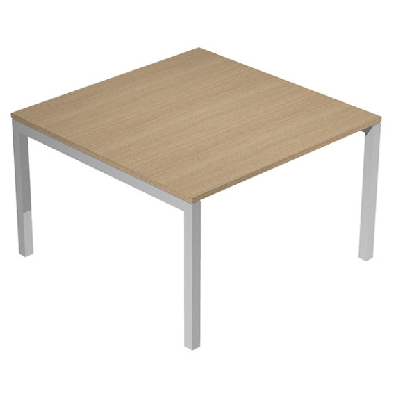 Tavolo riunioni con piano 120 x 120 cm, in spessore 25 mm, con assenza di spigoli vivi, bordato in abs sp.2 mm. Realizzato in materiale melaminico, classe E1, con finitura antigraffio e antiriflesso. Struttura in metallo, con solida gamba di sezione 50x50 mm. in finitura grigio alluminio. Piano dotato di ampio passacavi rettangolare centrale.