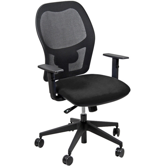 Seduta operativa girevole con elevazione a gas, meccanismo syncro, 4 blocchi anti shock e meccanismo a contatto permanente. Schienale con supporto lombare regolabile. Completa di braccioli regolabili. Rivestimento in tessuto SUPER - Target 100% poliestere idrorepellente antimacchia e reazione al fuoco classe 1. Alt.tot: 102-113cm. Prof.tot: 68cm. Alt.schienale: 60cm. Largh.schienale: 48cm. Largh.sedile: 48cm. Prof.sedile: 46cm. Alt.sedile: 42-54cm.