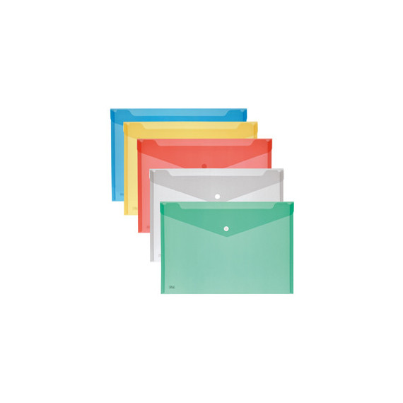 Buste orizzontali in polipropilene con chiusura a bottone. In confezione colori assortiti. Formato utile: 33,5x23,5cm.