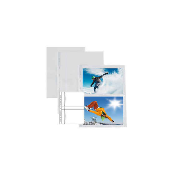Buste in PP liscio con foratura universale per la raccolta di fotografie. Dotate di 2 tasche per lato da 13x18cm (Inserimento foto laterale) I due lati sono separati da un divisorio bianco. Formato busta 21x29,7cm.