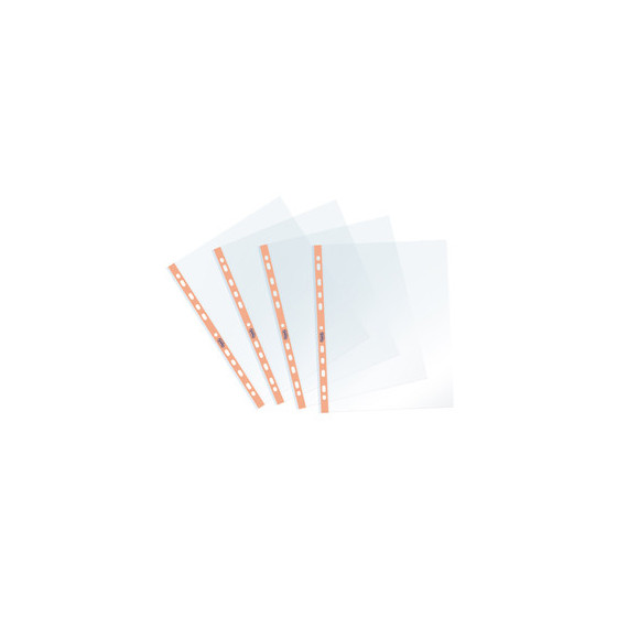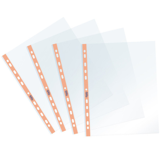 Busta forata con banda pastello realizzate in PP trasparente. Finitura liscia in 4 colori pastello: celeste, cipria, pesca e glicine. Formato utile 22x30cm.