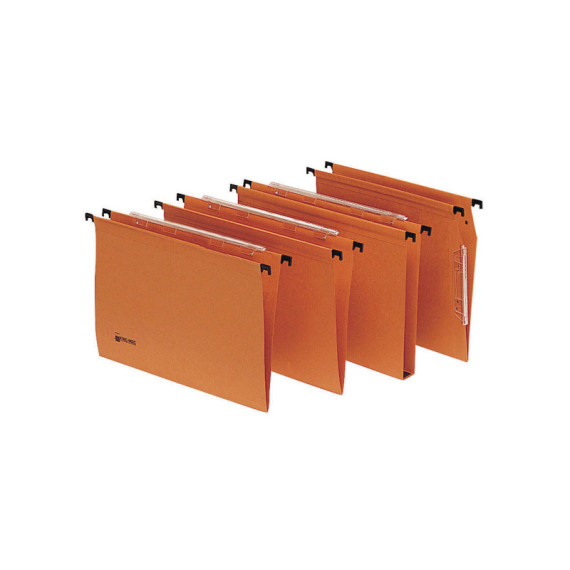 Cartelle sospese da armadio Signaletic realizzate in robusto cartoncino kraft arancione da 220gr. Dotate di barre di sospensione in polystirene nero antiurto. Portaetichette in materiale plastico con lenticolare con sistema ad incastro per il collegamento in continuo. Formato esterno: 33x27,5cm. Interasse 33cm. Fondo U da 3cm. Confezione da 25cartelle.