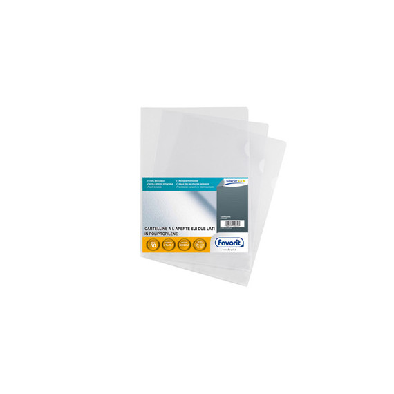 Cartelline a L trasparente a buccia d'arancia in polipropilene con lunetta per facilitare l'apertura. Formato utile: 21x29,7cm. Confezione da 50 cartelline. Made in Italy