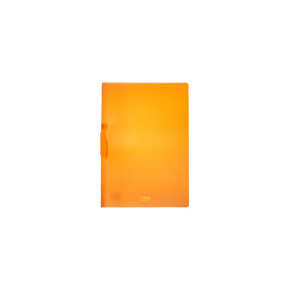 Cartelline realizzata in polipropilene 0,5mm trasparente arancione. Chiusura girevole ad incastro. Apertura della cartella a 180°. Capacità fino a circa 40 fogli. F.to utile: 22x30cm