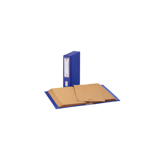 Classificatore alfabetico Mec in cartone grigio rivestito in carta plastificata blu. Meccanismo braghettario in metallo nichelato. Contiene 20 cartelline in robusto cartoncino Kraft color avana. Portaetichette in plastica rigida trasparente con etichetta. Formato utile LxH 23x32cm. Dorso 8,5cm.