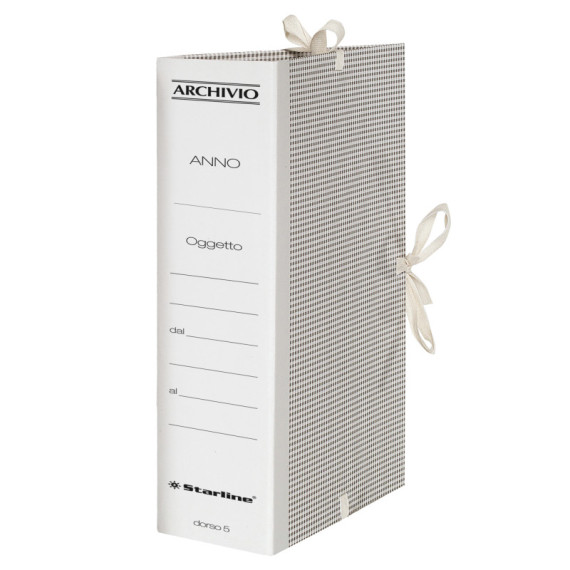 Cartella archivio con 3 lacci incollati. Realizzate in cartone teso grigio rivestito con carta uso mano da 80 gr/mq. Legacci a fettuccia fortemente fissati con collante. Formato 35x25cm. Dorso 5cm. Confezione da 25 faldoni.