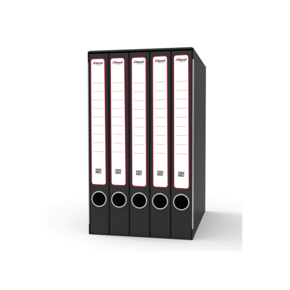 Sistema di archiviazione King Mec composto da un'unica custodia con 6 cartelline a 2 anelli (dorso 3,3 cm. formato utile LxH 23x33 cm). Struttura in robusto cartone grigio rivestito con carta goffrata nera antimpronta. Custodia in tinta con parabordi. Anello di estrazione in acciaio. Etichetta adesiva già posizionata sul dorso. Ideale per raggruppare fogli perforati. Dimensioni esterne 23,5x25x35 cm.