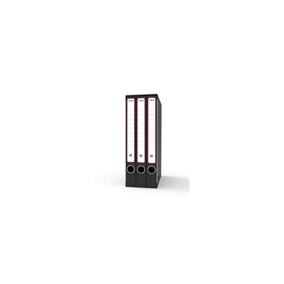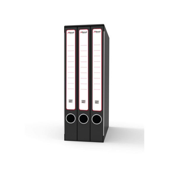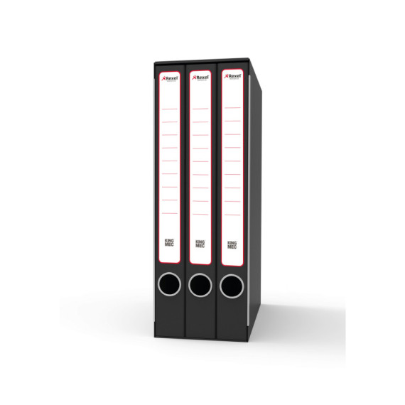 Sistema di archiviazione King Mec composto da un'unica custodia con 3 cartelline a 2 anelli (dorso 4 cm. formato utile LxH 23x32 cm). Struttura in robusto cartone grigio rivestito con carta goffrata nera antimpronta. Custodia in tinta con parabordi. Anello di estrazione in acciaio. Etichetta adesiva già posizionata sul dorso. Ideale per raggruppare fogli perforati. Dimensioni esterne 14x25x35 cm.