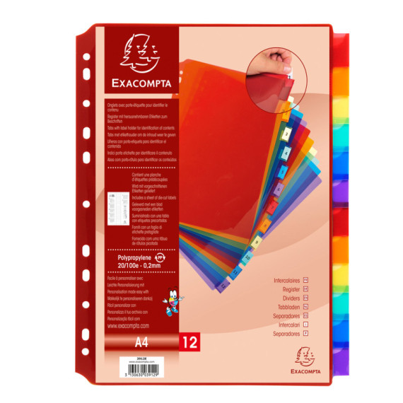 MARCHIO : ExacomptaMATERIALE : PplSPESSORE : 20/100EFORMATO ESTERNO : 22x30 cmFORMATO : A4TIPO DI PRODOTTO : IntercalariTIPO : NeutriNUMERO POSIZIONI : 12