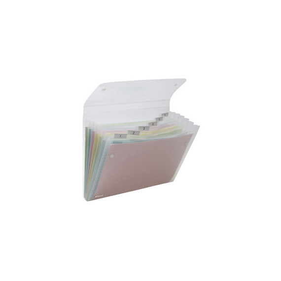 Cartelle a soffietto ICE realizzate in robusto polipropilene color trasparente traslucido. Contiene 6 scomparti dotati di cavalierino trasparente ed etichette per la personalizzazione. Formato utile: 22x30cm.