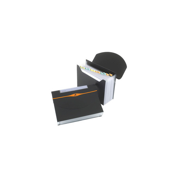 Cartelle a soffietto in robusto polipropilene finitura nera opaca. Internamente 13 scomparti dotati di cavalierino trasparente ed etichette colorate stampabili. Speciale patella di chiusura che consente un facile accesso ai documenti. Capacità fino a 500fg. Formato utile: 22x33cm