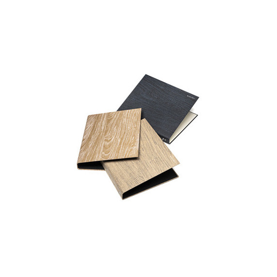 Raccoglitore a 4 anelli, diam. 30mm. Realizzato in cartone da 1,8mm e rivestito con carta 125gr certificata FSC® dalla trama innovativa che ricorda le venature del legno. Formato esterno 26x32x4cm. Assortito in 3 differenti colorazioni.
