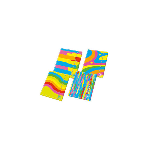 Raccoglitore 4 anelli diam. 30mm, formato esterno 26x32cm. Fantasie assortite in vivaci colori fluo.