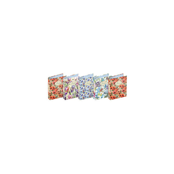 Raccoglitore a 4 anelli linea Pigna Nature Flowers. Struttura in cartone rivestito con carta uso mano stampata a motivi floreali. Formato esterno 27x32cm. Dotato di 4 anelli da 30mm.