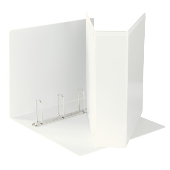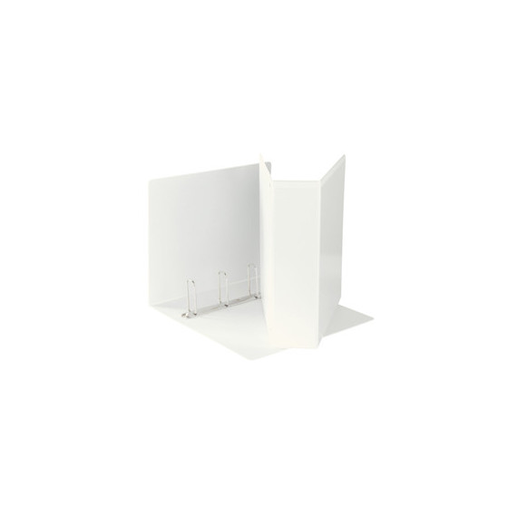 Raccoglitore display formato Maxi, in cartone da 2 mm rivestito in polipropilene eco-compatibile con finitura tipo pelle. Il rivestimento, incollato su entrambi i lati e saldato ai bordi, garantisce un prodotto di qualità eccellente. Il formato del raccoglitore consente di inserire indici e intercalari in formato Maxi per ospitare buste a perforazione universale. La personalizzazione è resa agevole da tre tasche esterne. Meccanismo a 4 anelli quadri (altezza 65 mm). Formato utile: 22x30 cm (A4). Dimensioni: 270x350x60 mm. Capacità: 580 fogli A4 (80 gr/mq). Colore bianco.
