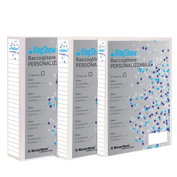 Raccoglitore STARLINE rivestito in polipropilene finitura goffrata, con tasca trasparente interna per appunti e meccanismo a 4 anelli (a D). Personalizzabile sul fronte e sul dorso. Contiene documenti formato A4.Caratteristiche di questo articolo:Codice: STL7036.Modello: Raccoglitore personalizzabile KingShow.Colore: bianco.Formato anelli: a D (altezza 50 mm).Dorso: 60 mm.Formato utile (LxH): 220x300 mm.Formato esterno (LxH): 285x320 mm.Confezione: 1 pz.