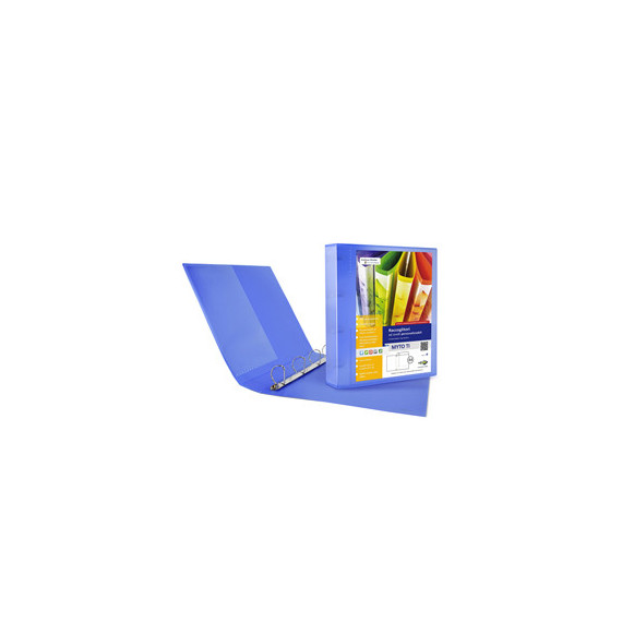 Raccoglitore personalizzabile in polipropilene colorato semitrasparente, con meccanismo a 4 anelli (a D). Dotato di tasche trasparenti sul 1° quadrante, sul dorso e all'interno. Inserimento facilitato della personalizzazione del dorso. Formato esterno: 275x320 mm. Formato contenuto: 220x300 mm (A4). Dorso: 40 mm. Diametro anelli: 30 mm. Colore blu.