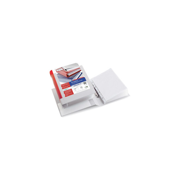 Raccoglitore personalizzabile in Colpan® (cartone rivestito in PVC) con tasca interna e meccanismo a 2 anelli (a D). Tasche trasparenti sul 1° quadrante e sul dorso che consentono l'inserimento facilitato della personalizzazione. Formato esterno: 260x310 mm. Formato contenuto: 220x300 mm (A4). Dorso: 40 mm. Diametro anelli: 25 mm. Colore bianco.