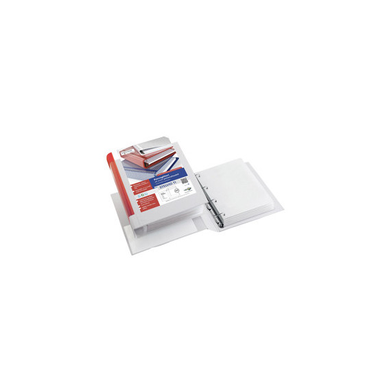 Raccoglitore personalizzabile in Colpan® (cartone rivestito in PVC) con tasca interna e meccanismo a 4 anelli (a D). Tasche trasparenti sul 1° quadrante e sul dorso che consentono l'inserimento facilitato della personalizzazione. Formato esterno: 260x310 mm. Formato contenuto: 220x300 mm (A4). Dorso: 40 mm. Diametro anelli: 30 mm. Colore rosso.