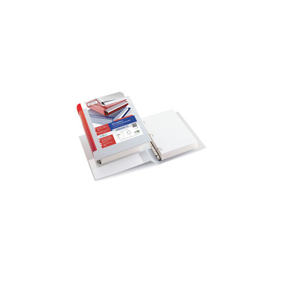 Raccoglitore personalizzabile in Colpan® (cartone rivestito in PVC) con meccanismo a 3 anelli (a D). Dotato di tasche trasparenti sul 1° quadrante e sul dorso. Inserimento facilitato della personalizzazione del dorso. Tasca interna non presente. Formato esterno: 205x225 mm. Formato contenuto: 150x210 mm (A5). Dorso: 50 mm. Diametro anelli: 30 mm. Colore bianco.