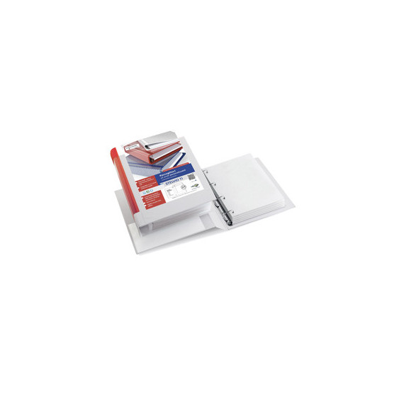 Raccoglitore personalizzabile in Colpan® (cartone rivestito in PVC) con meccanismo a 4 anelli (a D). Dotato di tasche trasparenti sul 1° quadrante e sul dorso. Inserimento facilitato della personalizzazione del dorso. Tasca interna non presente. Formato esterno: 210x225 mm. Formato contenuto: 150x210 mm (A5). Dorso: 40 mm. Diametro anelli: 25 mm. Colore bianco.
