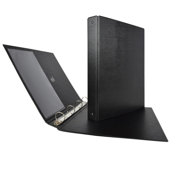 Raccoglitore in Colpan® (cartone rivestito in PVC) con meccanismo a 4 anelli tondi e tasca interna trasparente. Utili in ufficio, a scuola e a casa. Formato esterno: 265x310 mm. Formato contenuto: 220x300 mm (A4). Dorso: 30 mm. Diametro anelli: 25 mm. Colore nero.