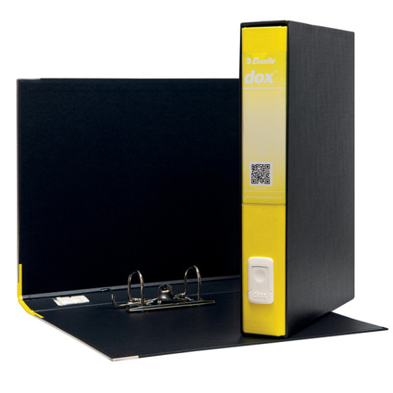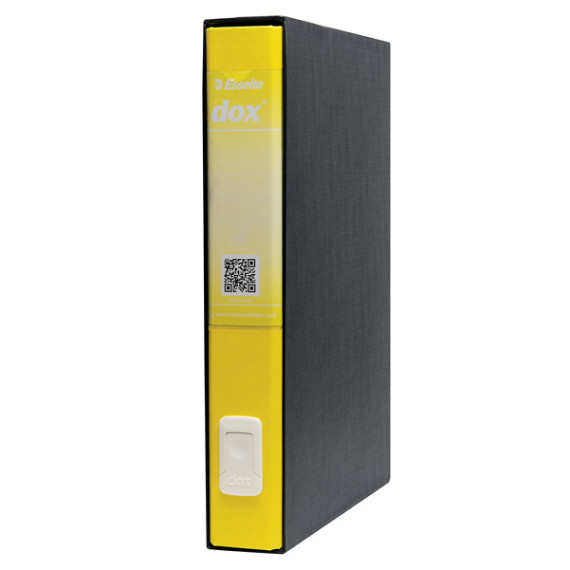 Nuovo registratore Dox® 5 dotato di linguella per l'estrazione a scomparsa 3 volte più resistente, caratterizzata da un design con presa più ergonomica, più agevole e arrotondata (l'area rientrante suggerisce il gesto per estrarre correttamente).Struttura in cartone rivestito con carta goffrata antimpronta e rifinito con paralati metallici alla base della plancia. Custodia in fibrone rivestito con carta nera goffrata trattata antimpronta, interno nero e parabordi verniciati. Meccanismo a leva in acciaio nichelato con pressino. Dorso in materiale plastico colorato e portaetichette trasparente con etichetta reversibile.Ogni dox possiede al suo interno un volantino con il codice QR da applicare sull'etichetta e 3 semplici indicazioni per scaricare la app dedicata su App Store e Google Play. Dox infatti si trasforma in registratore intelligente grazie a mydox app, la soluzione facile e immediata per archiviare e reperire documenti (tutte le informazioni sono disponibili sul sito www.myesseltedox.com).Formato protocollo (LxH) 23x34 cm. Dorso 5 cm. Colore giallo. Dimensioni 59x352x288 mm.