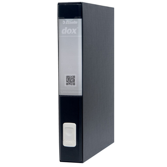 Nuovo registratore Dox® 5 dotato di linguella per l'estrazione a scomparsa 3 volte più resistente, caratterizzata da un design con presa più ergonomica, più agevole e arrotondata (l'area rientrante suggerisce il gesto per estrarre correttamente).Struttura in cartone rivestito con carta goffrata antimpronta e rifinito con paralati metallici alla base della plancia. Custodia in fibrone rivestito con carta nera goffrata trattata antimpronta, interno nero e parabordi verniciati. Meccanismo a leva in acciaio nichelato con pressino. Dorso in materiale plastico colorato e portaetichette trasparente con etichetta reversibile.Ogni dox possiede al suo interno un volantino con il codice QR da applicare sull'etichetta e 3 semplici indicazioni per scaricare la app dedicata su App Store e Google Play. Dox infatti si trasforma in registratore intelligente grazie a mydox app, la soluzione facile e immediata per archiviare e reperire documenti (tutte le informazioni sono disponibili sul sito www.myesseltedox.com).Formato protocollo (LxH) 23x34 cm. Dorso 5 cm. Colore nero. Dimensioni 59x352x288 mm.