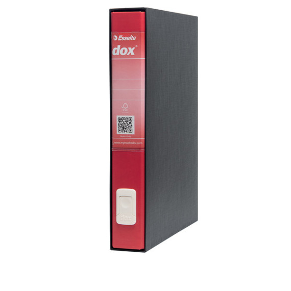 Nuovo registratore Dox® 5 dotato di linguella per l'estrazione a scomparsa 3 volte più resistente, caratterizzata da un design con presa più ergonomica, più agevole e arrotondata (l'area rientrante suggerisce il gesto per estrarre correttamente).Struttura in cartone rivestito con carta goffrata antimpronta e rifinito con paralati metallici alla base della plancia. Custodia in fibrone rivestito con carta nera goffrata trattata antimpronta, interno nero e parabordi verniciati. Meccanismo a leva in acciaio nichelato con pressino. Dorso in materiale plastico colorato e portaetichette trasparente con etichetta reversibile.Ogni dox possiede al suo interno un volantino con il codice QR da applicare sull'etichetta e 3 semplici indicazioni per scaricare la app dedicata su App Store e Google Play. Dox infatti si trasforma in registratore intelligente grazie a mydox app, la soluzione facile e immediata per archiviare e reperire documenti (tutte le informazioni sono disponibili sul sito www.myesseltedox.com).Formato protocollo (LxH) 23x34 cm. Dorso 5 cm. Colore rosso. Dimensioni 59x352x288 mm.