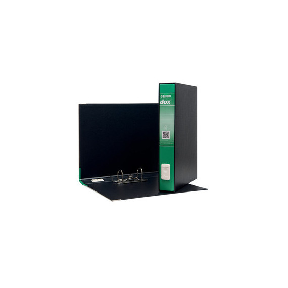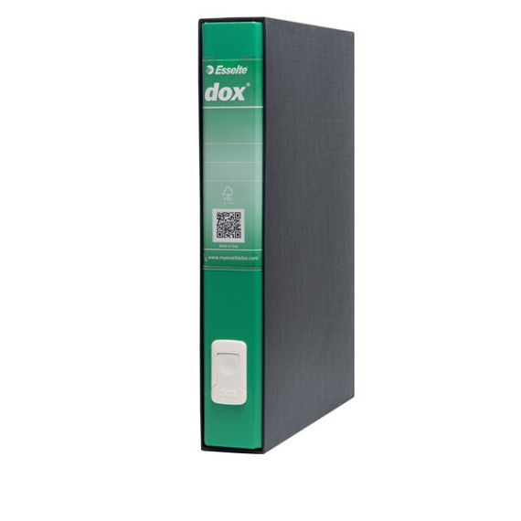 Nuovo registratore Dox® 5 dotato di linguella per l'estrazione a scomparsa 3 volte più resistente, caratterizzata da un design con presa più ergonomica, più agevole e arrotondata (l'area rientrante suggerisce il gesto per estrarre correttamente).Struttura in cartone rivestito con carta goffrata antimpronta e rifinito con paralati metallici alla base della plancia. Custodia in fibrone rivestito con carta nera goffrata trattata antimpronta, interno nero e parabordi verniciati. Meccanismo a leva in acciaio nichelato con pressino. Dorso in materiale plastico colorato e portaetichette trasparente con etichetta reversibile.Ogni dox possiede al suo interno un volantino con il codice QR da applicare sull'etichetta e 3 semplici indicazioni per scaricare la app dedicata su App Store e Google Play. Dox infatti si trasforma in registratore intelligente grazie a mydox app, la soluzione facile e immediata per archiviare e reperire documenti (tutte le informazioni sono disponibili sul sito www.myesseltedox.com).Formato protocollo (LxH) 23x34 cm. Dorso 5 cm. Colore verde. Dimensioni 59x352x288 mm.
