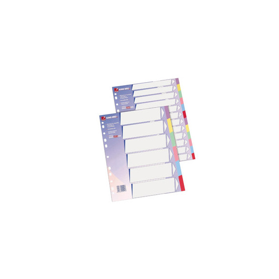 Separatori in cartoncino Manilla da 225 gr colorati in pasta (certificazioni ecologiche: well managed forest, elemental chlorine free, ph neutral, long life ISO 9706, heavy metal absence-CE). Dotati di 6 tasti neutri scrivibili e di indice frontale prestampato. Foratura universale. Formato: 21x29,7 cm (A4).