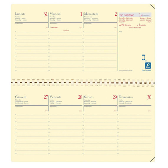 Agenda settimanale tascabile in formato orizzontale, una settimana su due pagine. 13 mesi da dicembre a dicembre, informazioni pratiche e rubrica intercambiabile. Carta avorio certificata PEFC, stampa bicolore, rilegatura con spirale. Edizione italiana.
