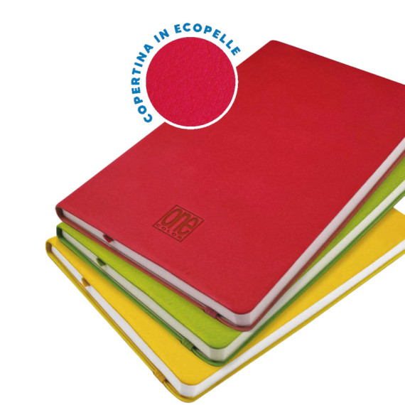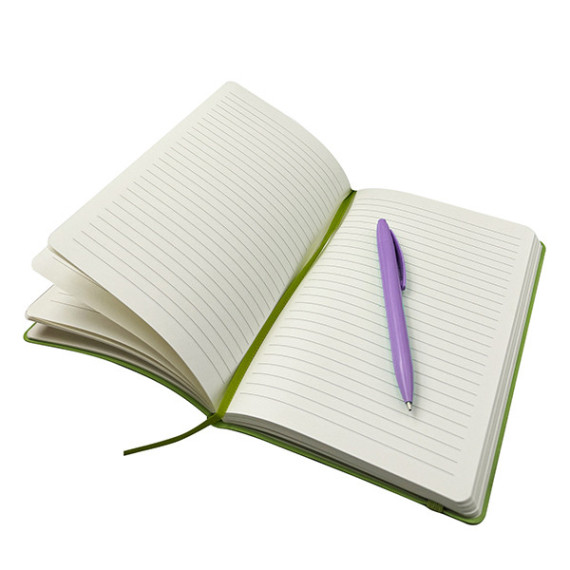 Taccuino con copertina morbida e tasca interna a soffietto. Dotato di elastico esterno e segnapagina coordinato al colore della copertina. Carta avoriata rigata da 70gr. 5 colori assortiti: nero, giallo, verde chiaro, fucsia e celeste. Confezionato singolarmente in cellophane.