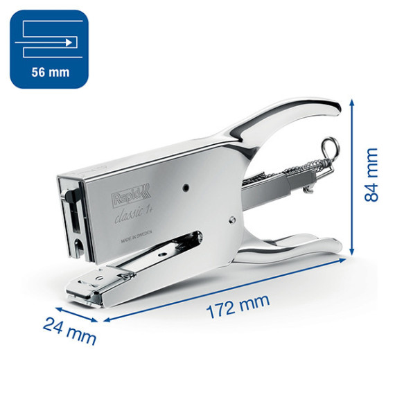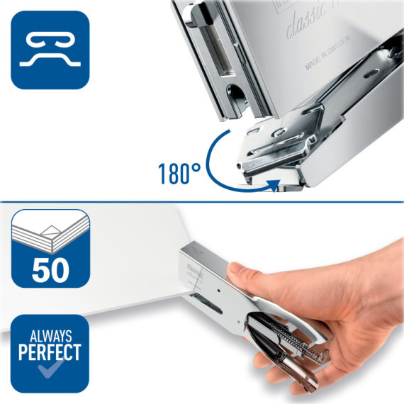 Cucitrice a pinza in acciaio cromato con piastrina di ribattitura regolabile per la scelta di cucitura. Capacità carica: 150punti. Cucitura: punto chiuso o aperto. Capacità di cucitura fino a 50fg. Profondità di cucitura 56mm. Utilizza punti 24/6-8. La più venduta nel mondo e la preferita dai fiorai. Ideale per uffici di smistamento, posta, negozi e grandi magazzini.