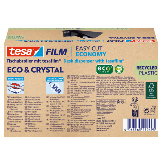 tesafilm® realizzato da bottiglie in PET riciclate - Nastro trasparente con forte legame. Perfetto per incollare, imballare,fissare, decorare e riparare. Nucleo del rotolo e dispenser da tavolo resistente realizzati in plastica riciclata al 100%. Caratteristiche:• Un contributo sostenibile: Il materiale di supporto è costituito al 90% da bottiglie in PET riciclate• Nastro trasparente di alta qualità: Un nastro adesivo trasparente e affidabile, invisibile sulla maggior parte dellesuperfici• Adesivo con altissime prestazioni: Il nastro è resistente agli strappi e mantiene l’adesività nel tempo• Svolgimento silenzioso: Il nastro si stacca dal rullo senza fare rumore• Facile da usare: Compatibile con tutti i dispenser tesafilm® - dispenser da tavolo resistente incluso• 90% di contenuto riciclato: Certificato UL2809 (procedura di convalida delle dichiarazioni ambientali ECVP)• Riciclabilità testata secondo il metodo INGEDE-12: Non pregiudica il ritrattamento del cartone.