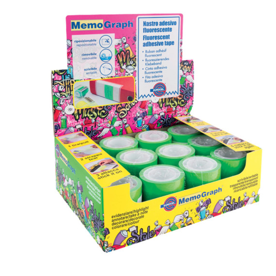 Nastro adesivo scrivibile e rimovibile, completamente trasparente in colori fluo. Sostituisce il classico foglietto adesivo ma senza staccarsi dalle superfici. Dotato di adesivo rimovibile, può essere staccato e riattaccato più volte senza rovinare i documenti.