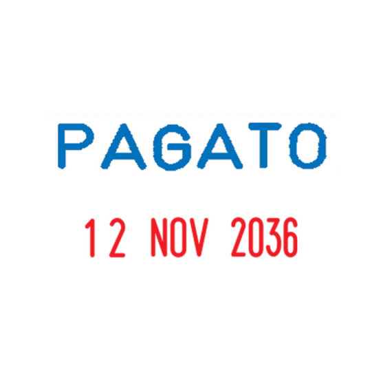 Timbro mini datario con dicitura fissa PAGATO con caratteri alti 4mm. Fusto antiurto in ABS. Tampone preinchiostrato bicolore blu/rosso (cod 38126). Tampone ricambio nero E/10 (cod 38117).