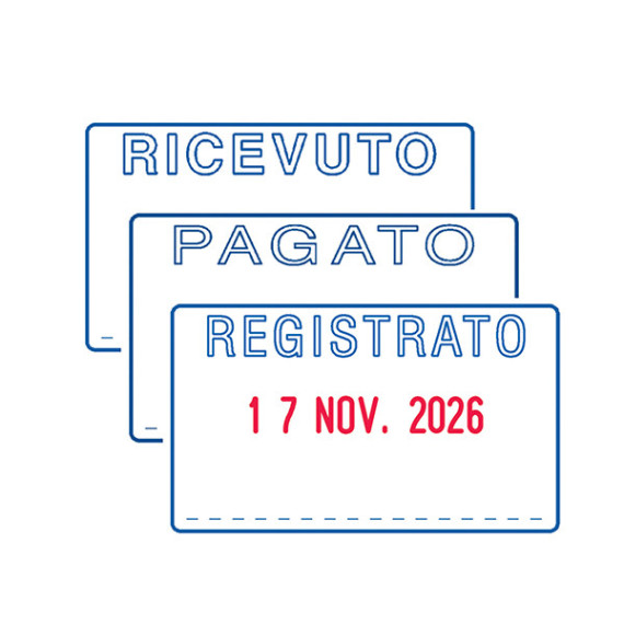 Datario autoinchiostrante per uso professionale con 3 testi intercambiabili: RICEVUTO, PAGATO, REGISTRATO. Altezza caratteri 4 mm. Impronta bicolore. Tampone ricambio 6/50/2