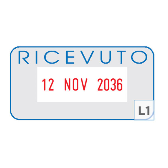 Timbro datario con dicitura fissa RICEVUTO. Fusto antiurto in ABS. Caratteri con altezza da 4mm. Tampone preinchiostrato bicolore blu/rosso (cod.48015). Tampone ricambio nero E/200 (cod. 91971).