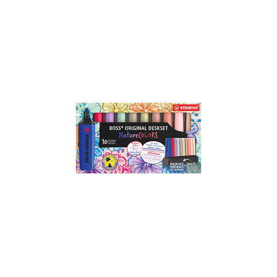 Evidenziatore stabilo boss NatureColors Wildflowers. Doppia ampiezza di tratto 2+5mm. Tecnologia Stabilo Anti-Dry-Out: resiste fino a 4 ore senza cappuccio. 10 evidenziatori nei colori: cipria, blu elettrico, giglio viola, borgogna, foglia di tè, verde oliva, fava di cacao, terra di Siena, cenere.